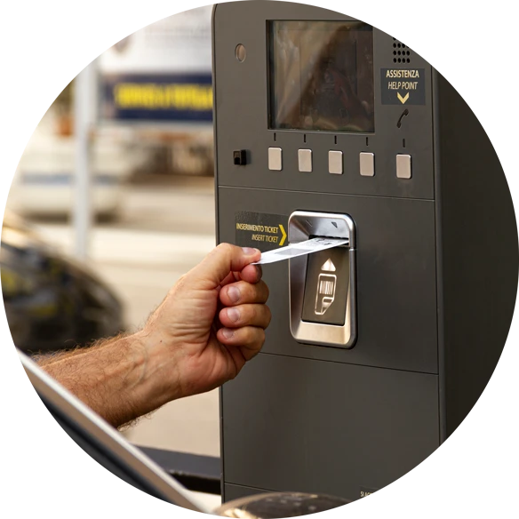 Terminata la sosta, vai alle casse automatiche e inserisci il biglietto (dove attivo digita la targa o il codice biglietto)